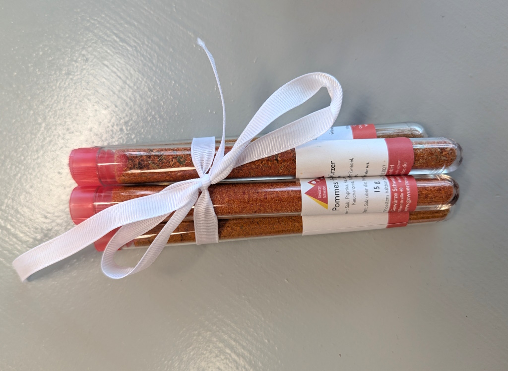 10 g Delikates Allwürzer Gewürzzubereitung (Infos und Zutaten zum Produkt finden Sie hier) 10 g Fisch Gourmet Gewürzzubereitung(Infos und Zutaten zum Produkt finden Sie hier) 15 g Pommes Gewürzsalz(Infos und Zutaten zum Produkt finden Sie hier) 10 g Cafe de Paris Gewürzzubereitung (Infos und Zutaten zum Produkt finden Sie hier) 13 g Geflügelwürzer(Infos und Zutaten zum Produkt finden Sie hier)