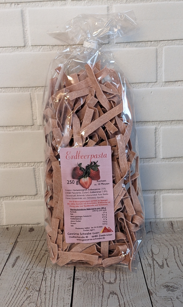 Zutaten: Hartweizengries, Erdbeerpüree (33%) (enthält Maisstärke, Zucker), Erdbeersirup (1,8%), Zitronensaft, färbende Lebensmittel: Rote Beete-Pulver, Konzentrate von (Schwarz-) Karotte.