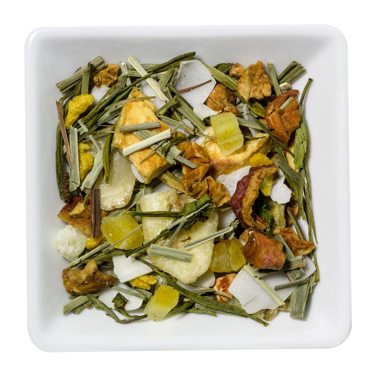 Zutaten: Lemongras, Apfelstücke, Bananenchips (Banane, Kokosöl, Zucker, Aroma), Kokos-Chips, Mangostücke (Mango, Zucker, Säuerungsmittel: Zitronensäure), Ananasstücke (Ananas, Zucker, Säuerungsmittel: Zitronensäure), Apfelecken, Ananas-Chips, Aroma, weißer Tee Anji White (3 %), Orangensaftstücke