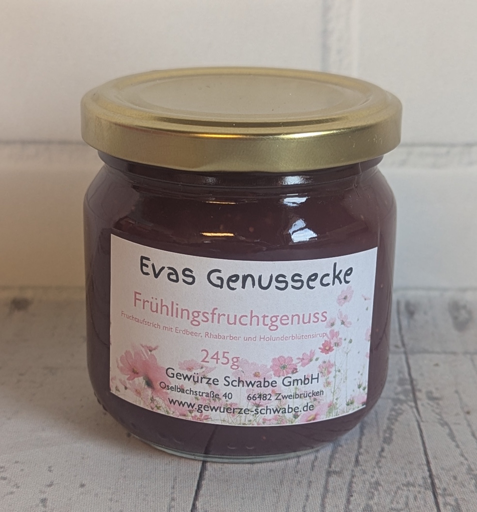 Zutaten: Gelierzucker (Zucker, Geliermittel Pektine, Säuerungsmitttel Citronensäure, Konservierungsmitter Sorbinsäure) Erdbeeren, Rhabarbernektar (Rhabarbersaft, natürliches Mineralwasser, Rohrohrzucker, Holundersaft), Holunderblütensirup (Zucker, Holunderblütenextrakt, Säuerungsmittel: Citronensäure, Vitamin C, Aroma