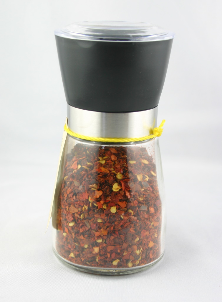 Diese Gewürzmühle aus Glas mit einem Keramikmahlwerk ist gefüllt mit 60g Peperoniflocken.