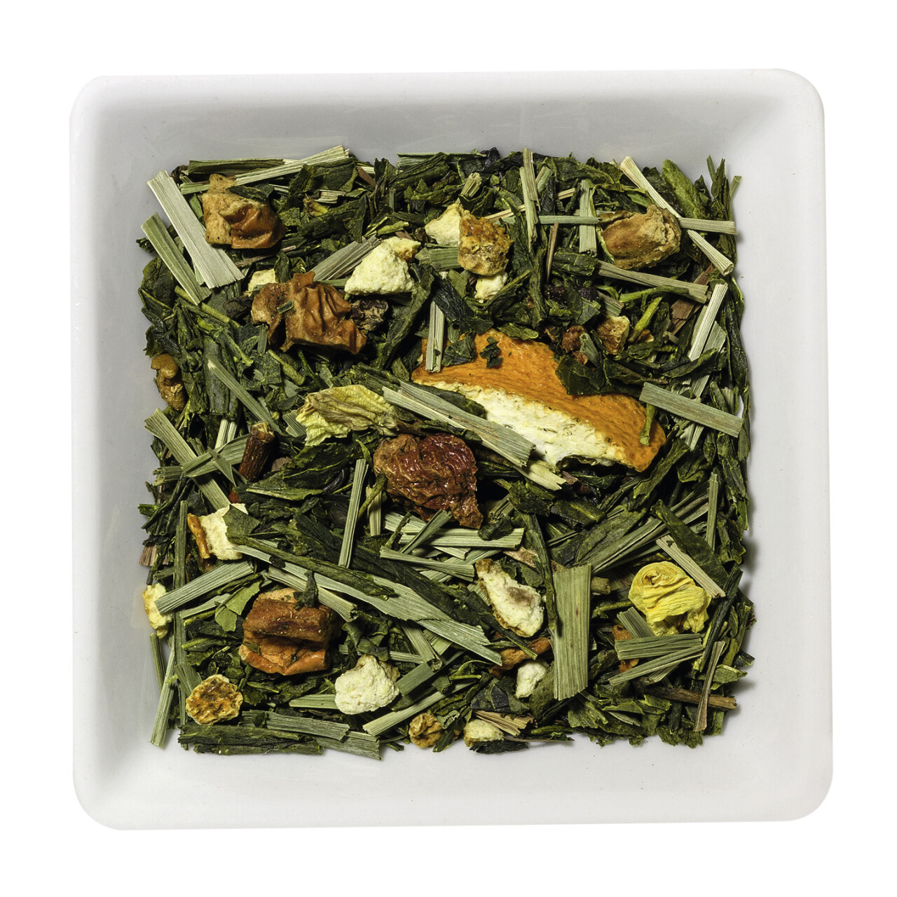 Zutaten: Grüner Tee (52 %), Apfelstücke, Lemongras, Zitrusschalen, natürliches Aroma, Zitrusscheiben, Brennnesselblätter, Guaranasaat, Hanfsaat, Orangensaftstücke, Sonnenblumenblütenblätter