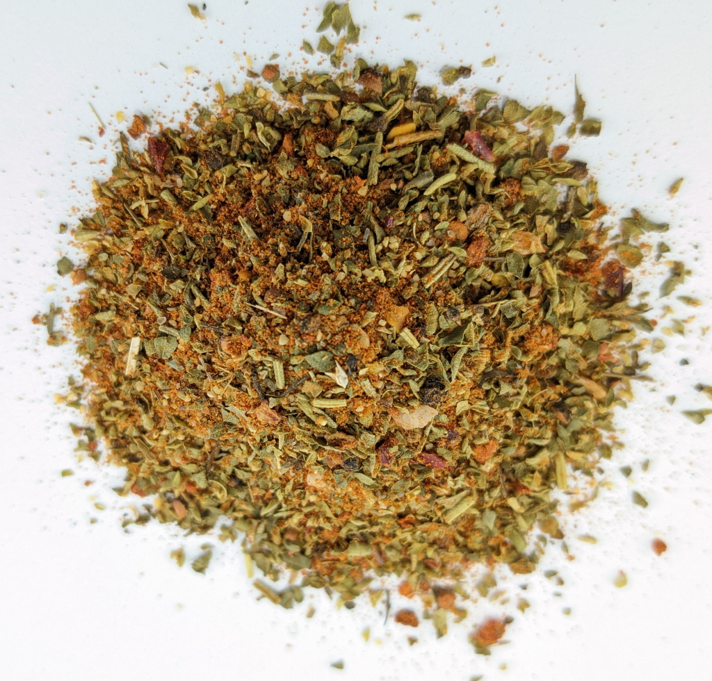 Zutaten: Paprika, Kräuter (Oregano, Thymian, Basilikum, Majoran, Bohnenkraut, Salbei, Rosmarin), Knoblauch, Pfeffer, Salz, Chilli, Paprikaflocken, Zwiebeln.
