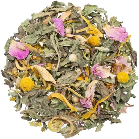 Zutaten:Fenchel, Pfefferminzblätter, Kamillenblüten, Tulsikraut, Koriandersaat, Melissenblätter, Rosenblütenblätter, Ringelblumenblütenblätter, Orangenblüten, Passionsblumenkraut.