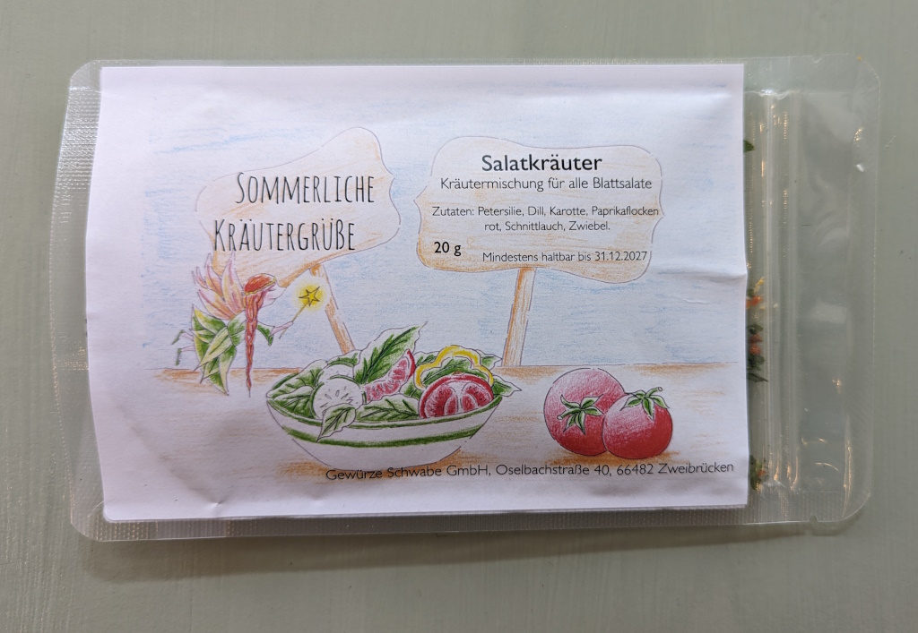 20 g Salatkräuter ( Zutaten und Infos finden Sie hier) schickt unsere Gewürzelfe Evi mit euren Grüßen auf den Weg.