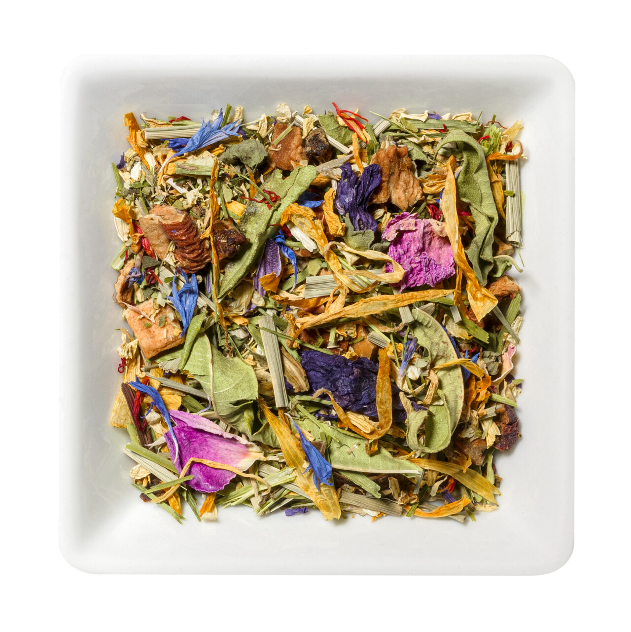 Zutaten: Apfelstücke, Lemongras, Zitronenverbene, Gerstengras, Sonnenblumenblütenblätter, Ringelblumenblütenblätter, Beerenblätter (Brombeerblätter, Schwarze Johannisbeerblätter), Malvenblüten, Pfefferminze, Kamillenblüten, Rosenblütenblätter, Saflorblütenblätter, Kornblumenblütenblätter