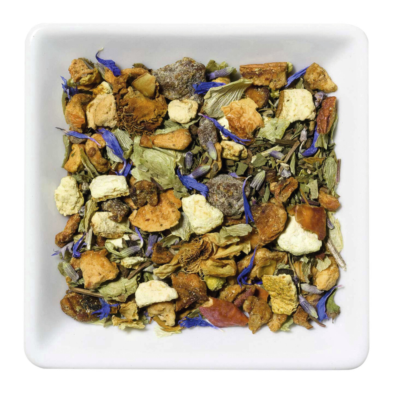 Zutaten: Apfelstücke, Pfirsichstücke mit Trennmittel Reismehl, Zitrusschalen, Pfefferminze, Zitronenmelisse, Hopfenzapfen, Baldrianwurzel, Lavendelblüten, Aroma, Teeblüten, Kornblumenblütenblätter.