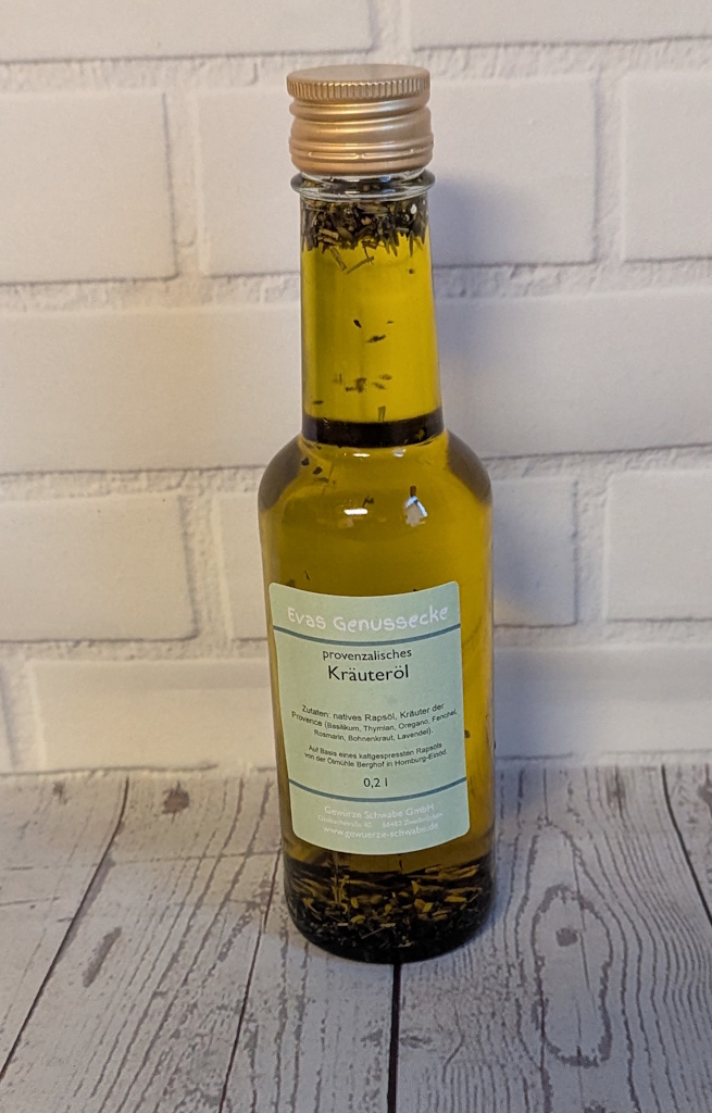 Dieses Rapsöl ist fein aromatisiert mit Kräutern der Provence, Pfeffer und Knoblauch.