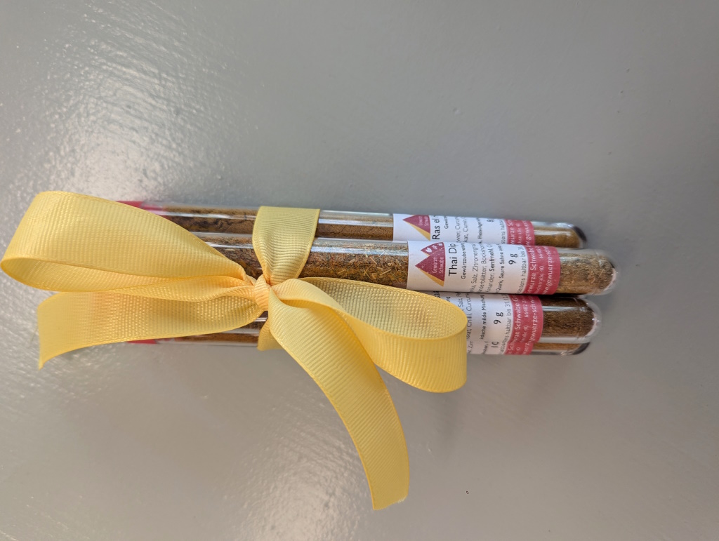 8 g Ras el hanout Gewürzmischung für Couscous und Eintöpfe (Infos und Zutaten zum Produkt finden Sie hier) 9 g Thai Dip Gewürzzubereitung für Dip, Fisch, Garnelen, Geflügel (Infos und Zutaten zum Produkt finden Sie hier) 10 g Harissa Gewürzzubereitung scharf für Couscous und orientalische Gerichte (Infos und Zutaten zum Produkt finden Sie hier) 10 g Tandoori Masala Gewürzzubereitung für Tandoori Hähnchen (Infos und Zutaten zum Produkt finden Sie hier) 9 g Garam Masala Gewürzzubereitung für Fleisch und Gemüsegerichte (Infos und Zutaten zum Produkt finden Sie hier)