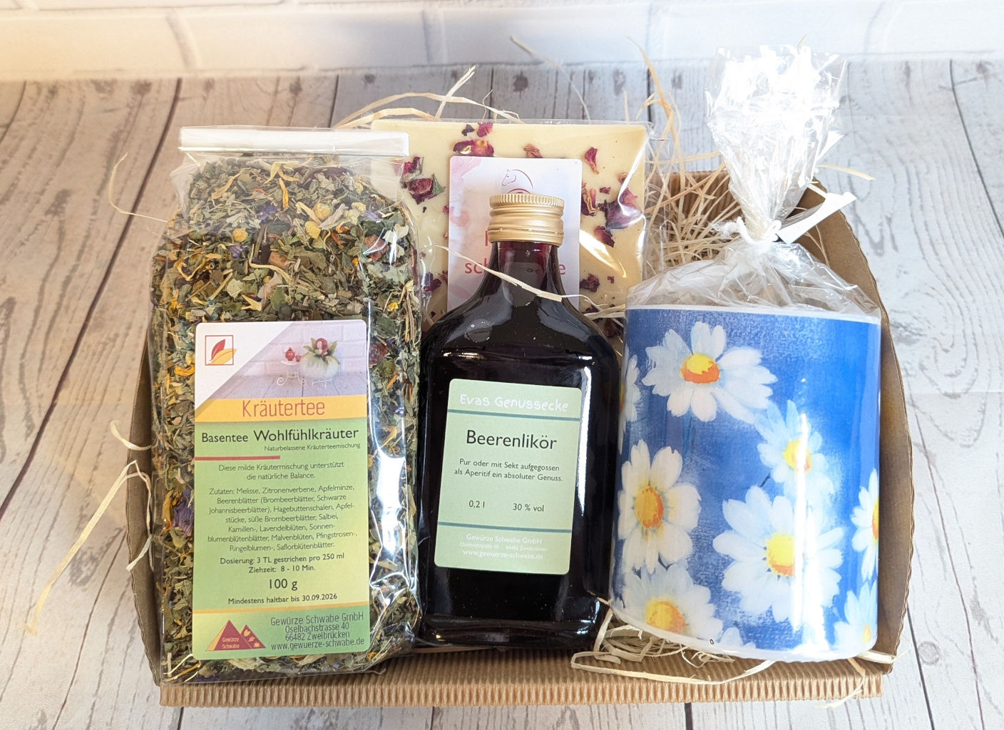 1 Teelicht und wahlweise 100g Basentee Wohlfühlkräuter(Infos und Zutaten zum Produkt finden Sie hier) oder 100g Früchtetee Wohlfühltee (Infos und Zutaten zum Produkt finden Sie hier) und wahlweise100 g Rosenschokolade mit Tonkabohne (Infos und Zutaten zum Produkt finden Sie hier) oder 100 g Vollmilchschokolade "Kaffeegenuss" (Infos und Zutaten zum Produkt finden Sie hier) und wahlweise 200 ml Tonkabohnelikör(Infos und Zutaten zum Produkt finden Sie hier) oder 200 ml Marzipanlikör(Infos und Zutaten zum Produkt finden Sie hier) oder 200 ml Beerenlikör(Infos und Zutaten zum Produkt finden Sie hier) oder 200 ml Pfirsichlikör(Infos und Zutaten zum Produkt finden Sie hier) oder 200 ml Exotiklikör(Infos und Zutaten zum Produkt finden Sie hier)